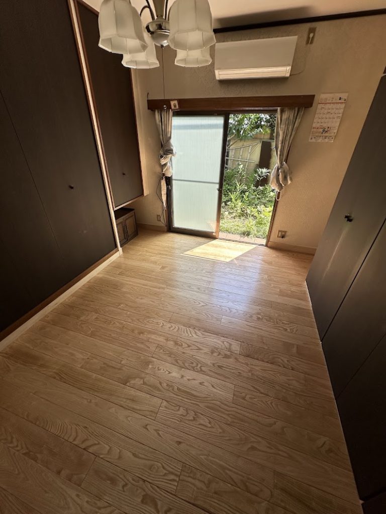 伊奈町でフローリング張り工事を行いました。元々は絨毯が敷かれていたお部屋でしたが、お客様から「ベッドを使用するためフローリングに変更したい」というご要望をいただきました。床材にこだわりたいとのことでしたので、今回は栗材フローリングを採用しました。