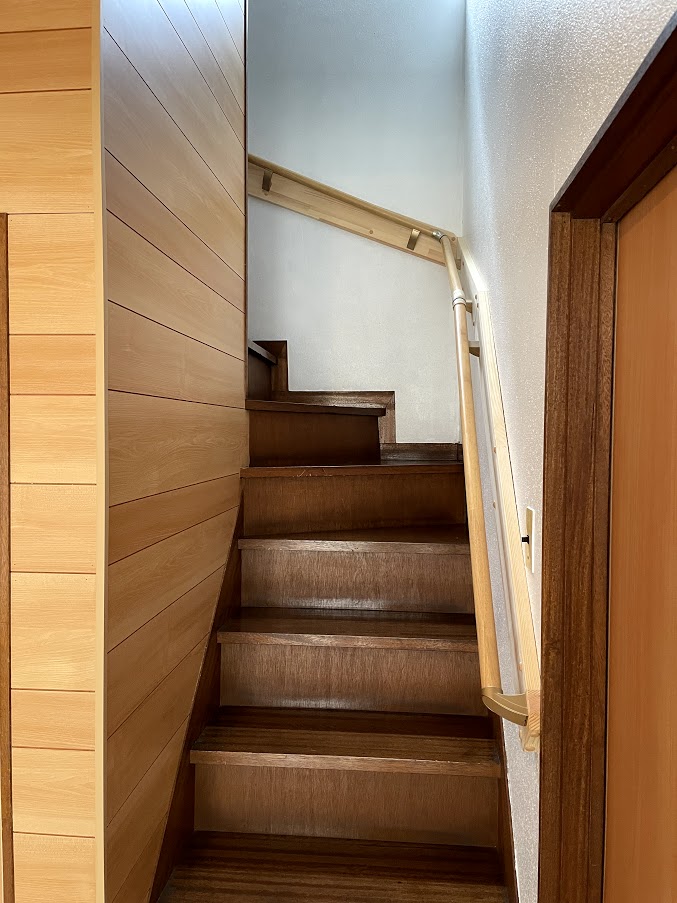 階段の手摺付け・玄関廊下廻りの板張り工事・トイレのパネル貼りを施工しました。